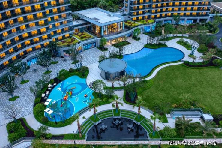 自由式的 戏水池 嵌在中轴之上, 将 镜面泳池通 过高差关系的处理,充分利用海景打造 无边泳池 之感,将海景资源最大化。