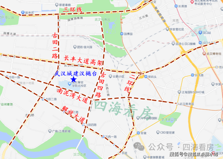 武汉城建汉樾台位于长安路以北,古田二路以东,湖北警官学院旁,在楼市划分中属于古田板块,行政划分属于硚口区,距离二环线约1.9公里,距离三环线约2.3公里,属于2.5环。