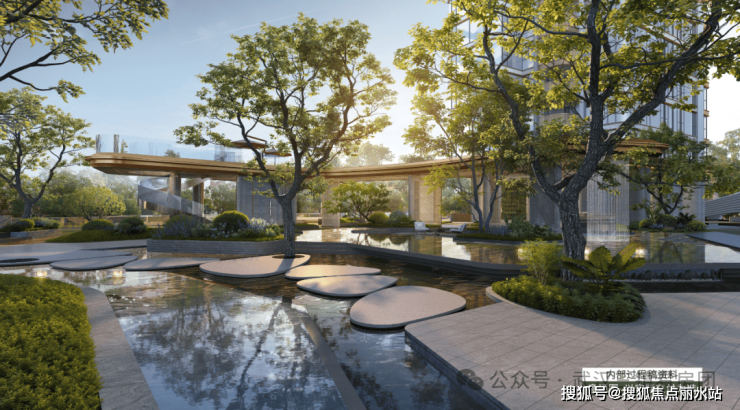 【度假岛景观】一字布局引水入园,搭配多层次立体植被,12座"岛"与3座"屿"串联,打造沉浸式度假生活场景。