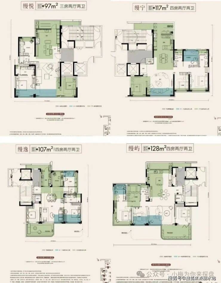 具体分为A、B两个地块,北面为A,南面为B,规划为洋房、高层建筑。一共包含21栋住宅,除了2、13、14号楼为32层的高层之外,其余楼栋均为9-10层的小高层,小高层是户户带有空中花园的真四代。面积段为97—107—117—128户型图如下。107的户型做了四房这点的确有点抢眼,根据小梅了解高层的得房率能干到116%的得房率,小高层四代则干到130%的得房率,的确颠覆了我的认知。