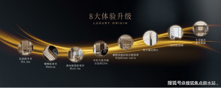层高跃升至3.3米、楼梯拓宽至85cm、南向面宽拓宽至10.7米、车位尺寸升级占比约25%、叠墅改造后综合使用率可达约160%-181%、剪力墙比例小、三玻两腔玻璃、专业隔音排水系统。