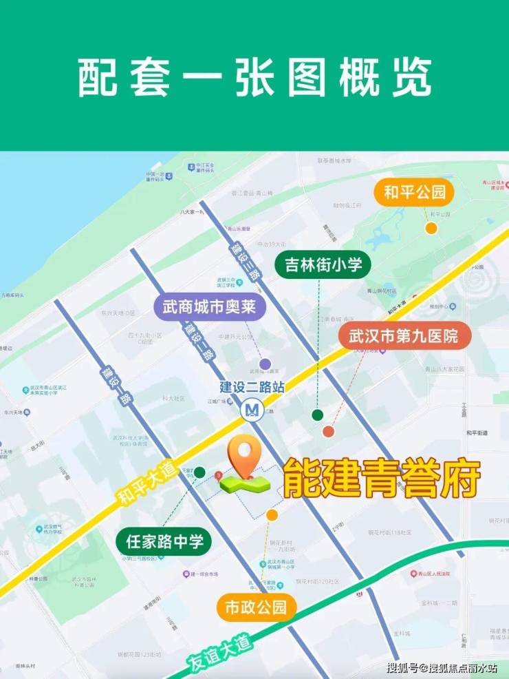能建青誉府位于青山区和平大道以南,建设二路与吉林街交汇处,它是整个青山区在售新盘中离内环线最近的楼盘之一,直线距离1.6公里到2环线,整个青山区最核心的医疗、教育、商业、交通资源也都分布在周边。