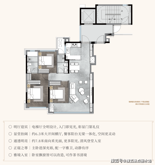 从精心规划电梯前厅到完善储藏间体系;从约6.3米大开间横厅,餐客阳台无梁一体化到约7.8米南向釆光面;所有卧室飘窗皆可以改造,可作茶书清境……赋予空间极高使用率与未来改造灵活性。