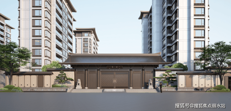 延续王府东方门仪,尊贵显赫。融合歇山顶、朱门金钉、斗拱飞檐、石狮等中国元素,彰显中国世家门第礼序。