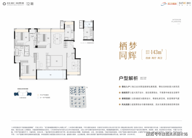 该户型位于2、3号楼端头边户,南北通透,3.5开间朝南且三面采光,该户型格局与上文建面约143平户型类似,都是私密性和功能性兼具的优质产品。