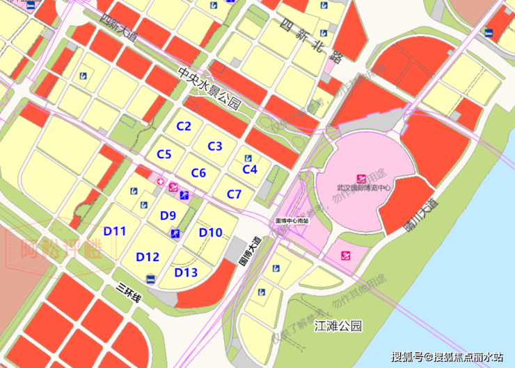 东边是鄂渚路、D13地块、D14地块、国博大道等。