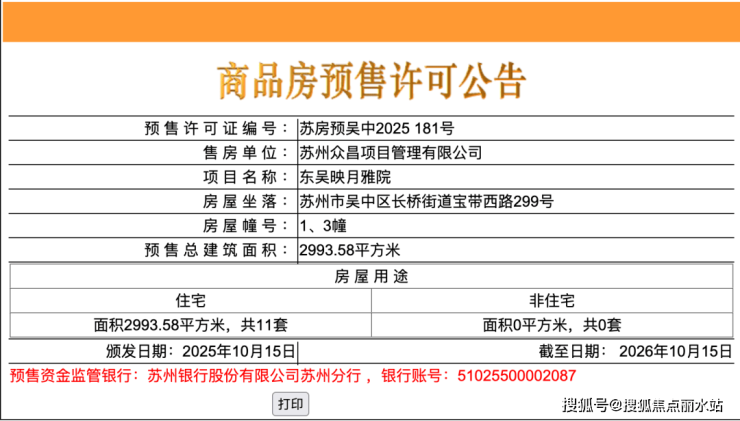 是今年 1 月 8 日,吴中建设以底价23443 万元竞得该地块,成交楼面价15040 元 /㎡,土地性质为商住混合用地,占地面积10391.2㎡,总建筑面积25919.37㎡,计容建筑面积15586.8㎡。
