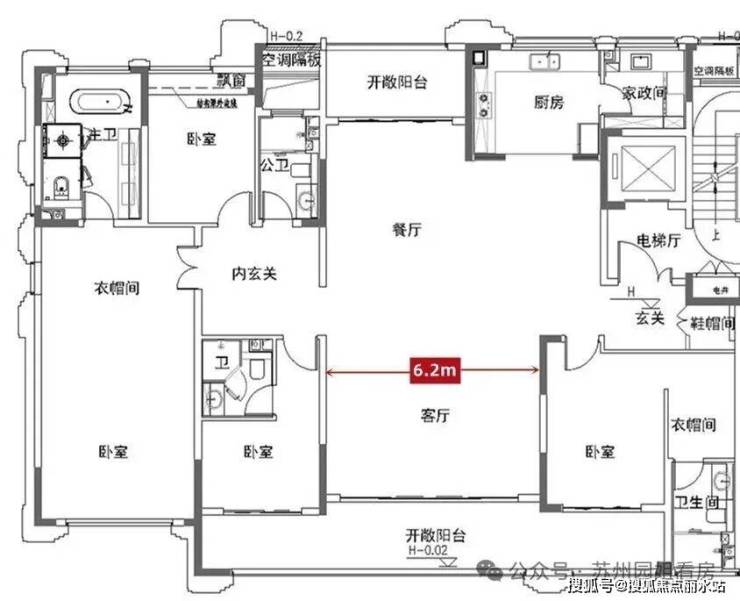 该户型测算面积约265㎡,4房4卫,拥有近20米南面宽+约13.2米开敞阳台,朝北也带约4.1米开敞阳台,变相赠送了套内面积。