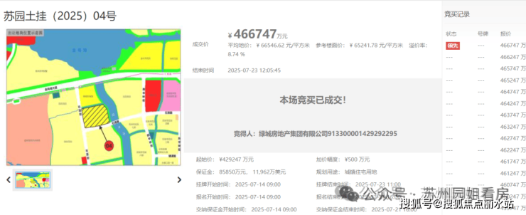 成功刷新苏州土拍纪录,成为江苏省楼面价TOP1!