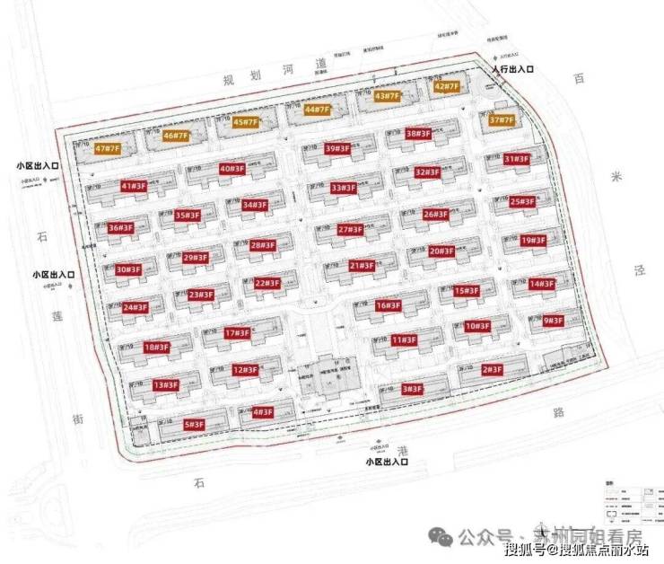 项目总平面如下,南低北高布局,三个小区出入口、两个人行出入口,其中南大门作为主出入口设置了下沉式庭院,预计未来作为会所配套使用。