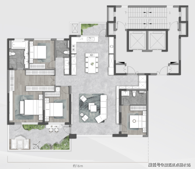 其中,建面约165m²四室三厅大平层户型,南向足足16米面宽,并且做到四开间朝南。