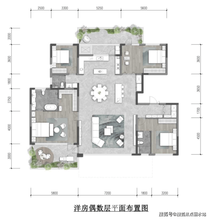 面积约107m²LDKG无界方厅,南向面宽达7.2米搭配整面落地玻璃,为业主提供接待访客、品茶阅读的好地方。