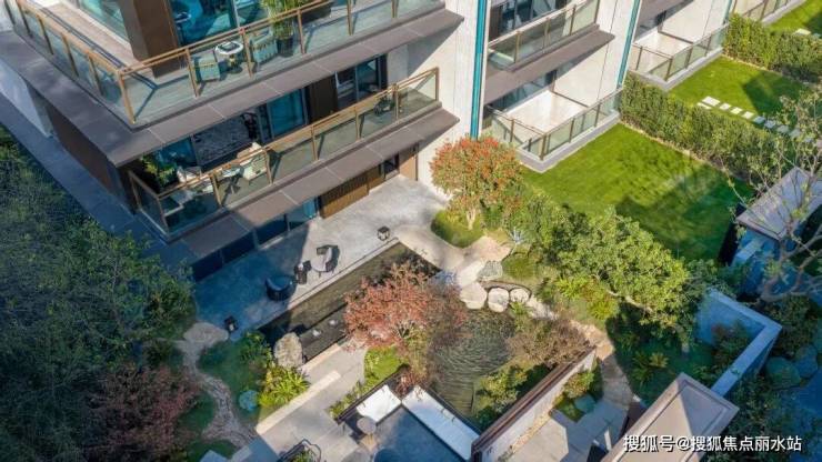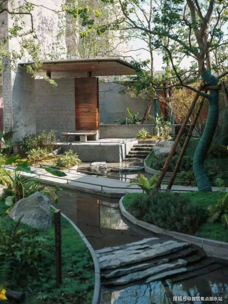 清浅水景映着石板茶区,错落绿植衬得天地敞亮,归家即拥有一方松弛秘境。
