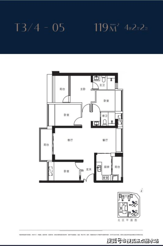 3栋4栋05户型119㎡4房2卫 客厅朝西带阳台,3房朝西,1房朝东