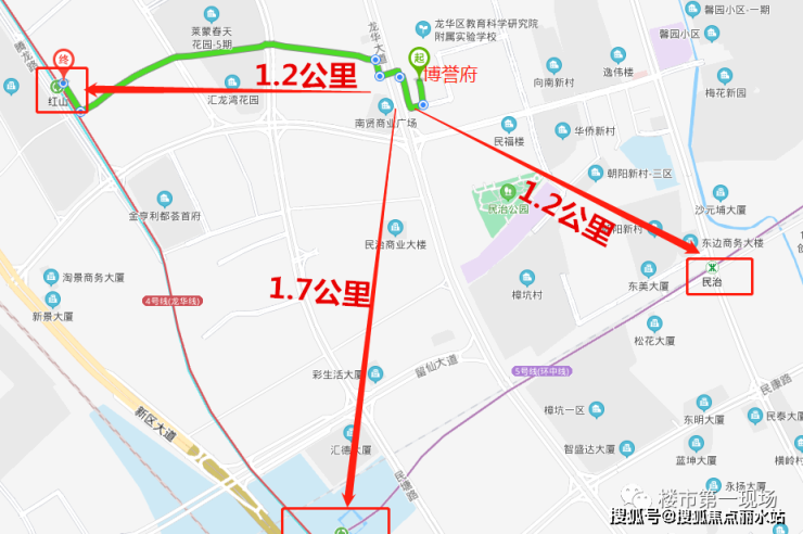鸿荣源博誉府属于龙华红山片区,位于龙华大道和民旺路交汇处,紧邻深圳北站商务中心及红山商住片区,项目两边分别挨着公园和龙华科学院附属实验学校,仅隔龙华大道,斜对面有绿景公馆1866、莱蒙水榭春天等大型社区,与金亨利等住宅社区项目隔路相邻;东向则是民治传统的商业中心,拥有大量的居住群体及多元化的商业配套。