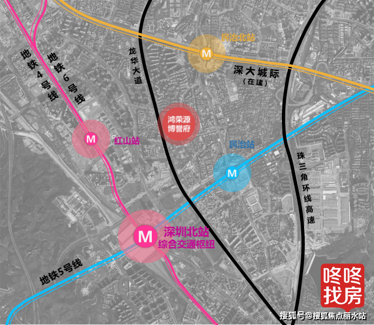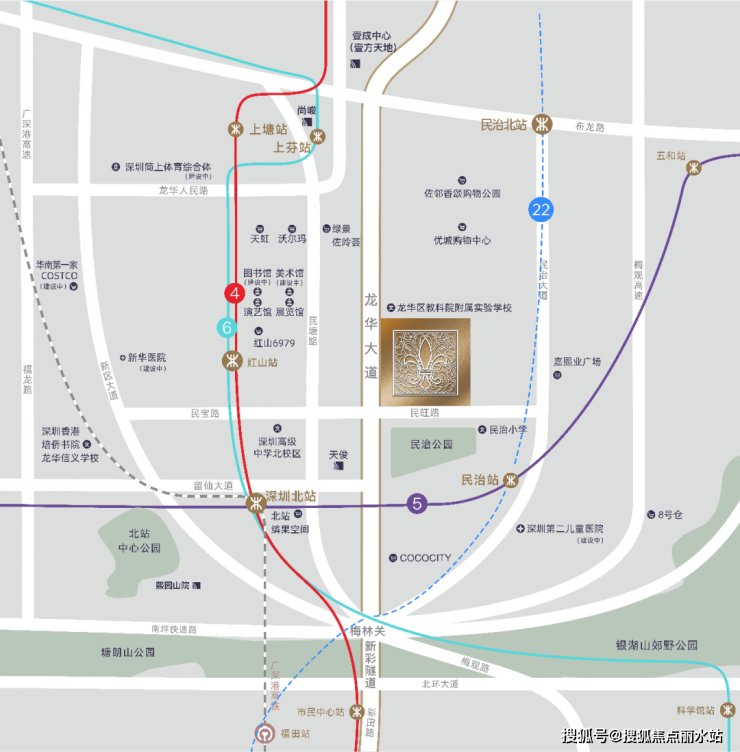 l 深圳北站高铁枢纽、地铁4/5/6/22号线(规划中)四轨交汇环绕,五横六纵多维立体路网,无界城心繁华