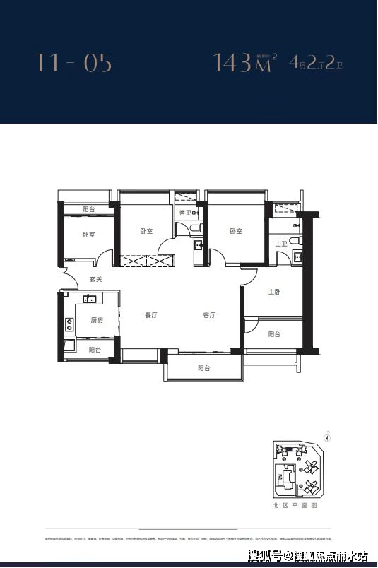 1栋2栋05户型143㎡4房2卫 客厅横厅朝南带阳台,主卧朝南3房朝北