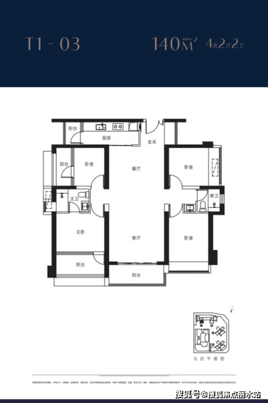 1栋2栋03户型140㎡4房2卫 客厅朝南带阳台,2房朝南,1房朝东,1房朝西