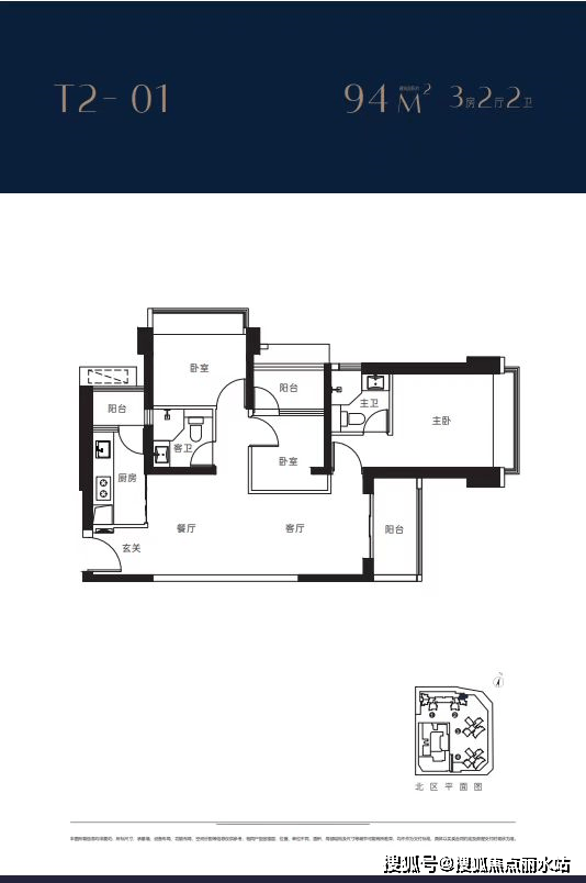 1栋2栋01户型94㎡3房2卫 客厅朝东带阳台,主卧朝东,2房朝北