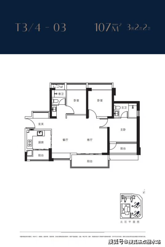 3栋4栋03户型107㎡3房2卫 客厅横厅朝南带阳台,主卧朝南,2房朝北