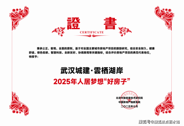 近日,在中指研究院全国“好房子”研究与优选工作中,武汉城建·雲栖湖岸项目以过硬的产品力荣膺 “2025年人居梦想好房子”称号。这份来自权威机构的认证,正是对雲栖湖岸精工品质与匠心筑家的有力印证,实力彰显何为理想人居标杆。