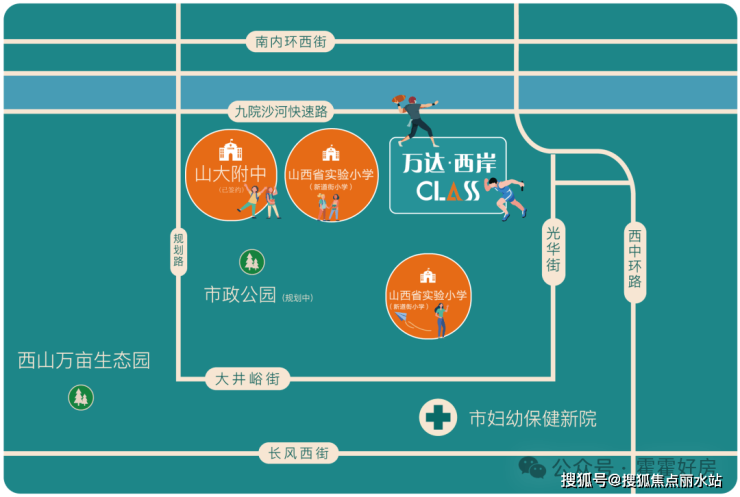 2020年9月,万柏林区教育局与山西省实验小学教育集团成功签订教育发展战略合作协议,在煤气化片区打造山西省实验小学万柏林第一校区与山西省实验小学万柏林第二校区(新道街小学),切实满足人民群众对优质教育的新期待。两所小学按照土地出让条件,由中铁诺德逸尘云著项目以及华润·华侨城公园九里项目无偿代建,建成后移交万柏林区教育局。两所小学是属于区教育局统一管理的公立公办小学,目的是保障煤气化片区居民义务教育阶段需求。万达·西岸CLASS位于南内环西街与西中环交汇处西南角。项目主推85-135㎡户型,支持一次性、按揭付款,开发商担保公积金贷款。