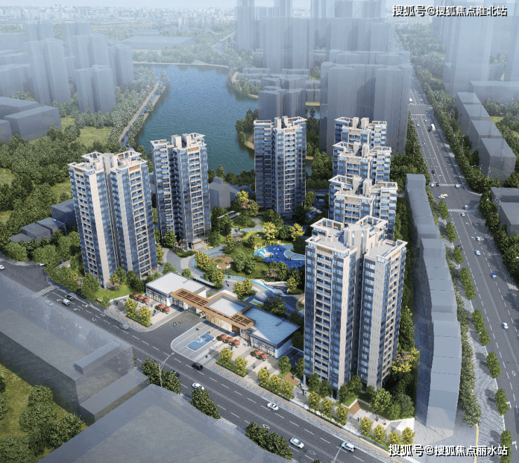 建筑设计:采用围合式 V 型布局,外立面用类幕墙和铝板打造,美观大气,使更多楼栋能享受到湖景。