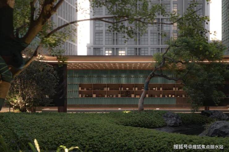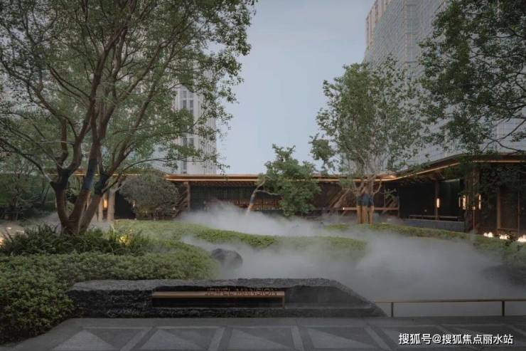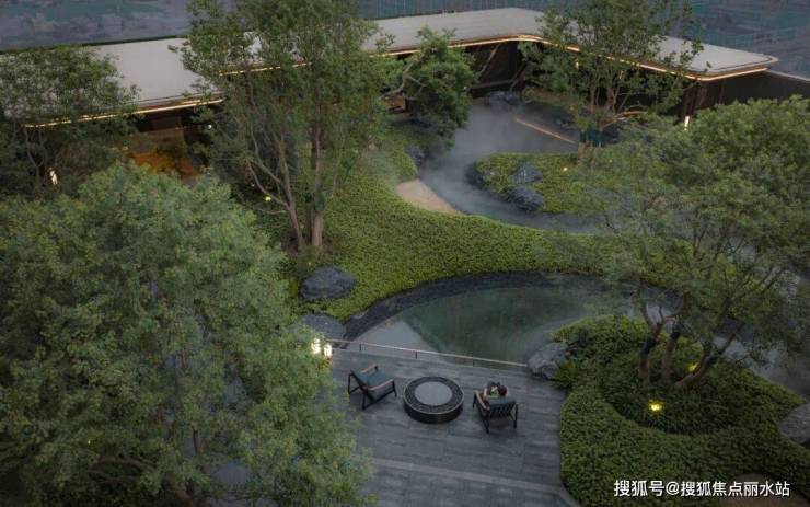项目近万方园林由景观大师上山水比德打造,规划“一轴、一环、八境”,一条约200米的山水文化轴,将金阙台、隐风亭、花间庐、琉光院、林海渚五大生活场景串联。