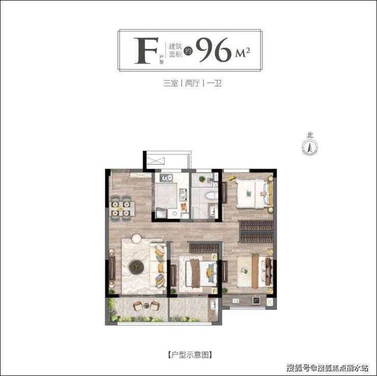 ▼主力户型:高层约96㎡三室两厅一卫户型