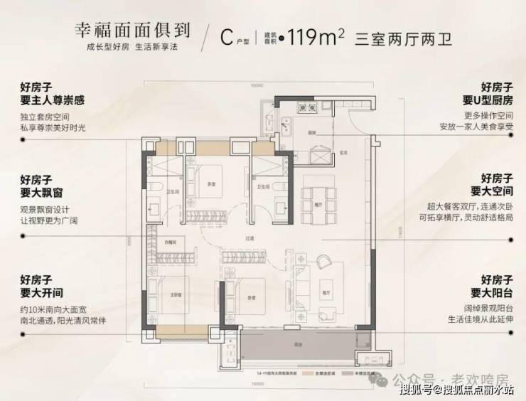 119平户型为边户,拥有约10米的南向大面宽,整个户型可拓展面积也比较多,几乎每个空间都有飘展。