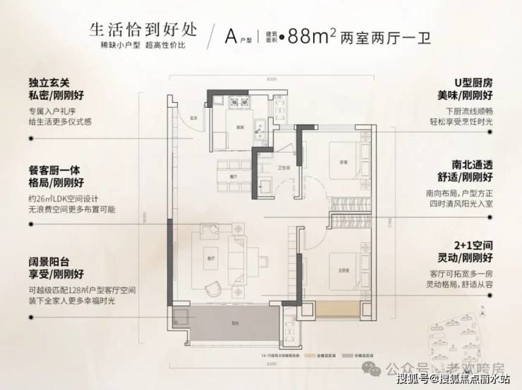 88平为2+1房,中间户,面宽达到8.2米,阳台进深明显加大,得房率有了较大提升,而且承重墙不多,可改造空间比较大。