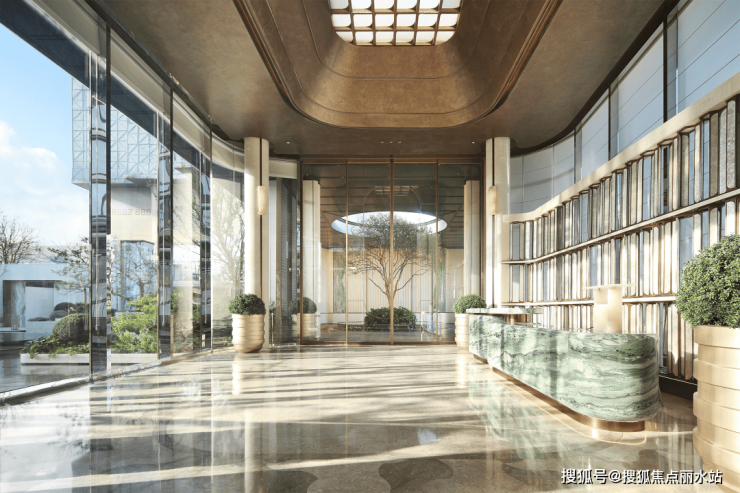 社区主入口是超宽幅门头,宽约 80m 高约 7.1m,两侧的维多利亚绿奢石以及中央的白雪公主透光石很吸睛,浅色的部分则是贝金米黄石材,圆弧的工艺处理也更显温润及价值感,中央栽植的超大紫薇树拥有约60年树龄,底部则是采用宝格丽黑奢石作为基座。