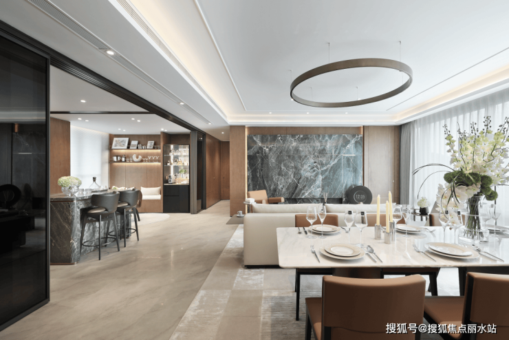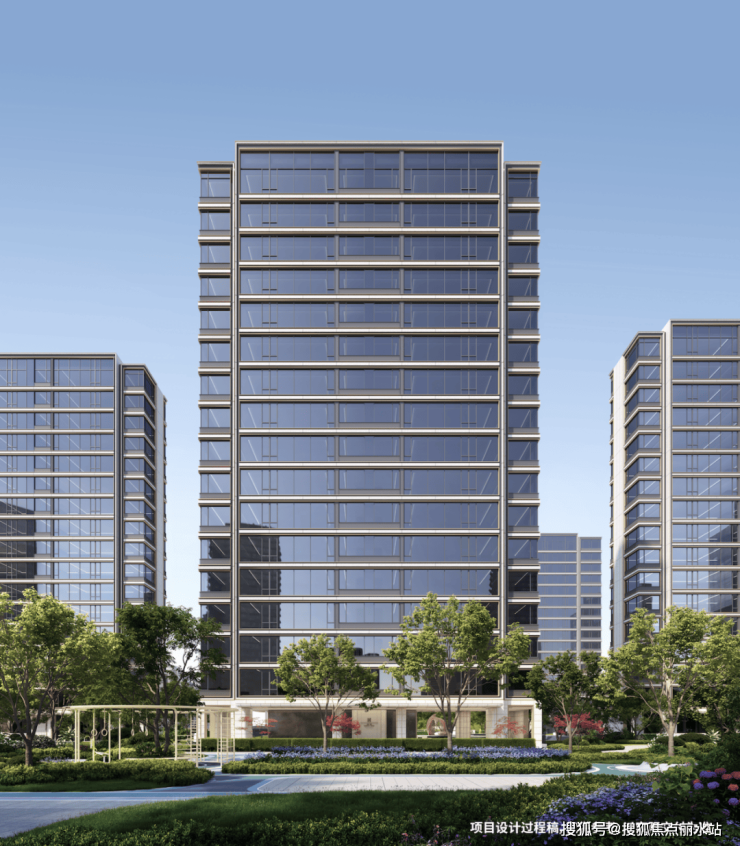 建筑美学上,高区以极简笔触勾勒,超纤细Bezel-less边框、大幅窗墙比与四面铝板公建化立面,彰显力量与序列感;低区基座选用白玫瑰石材,大面积玻璃与金属线条,营造温润亲近的体验。