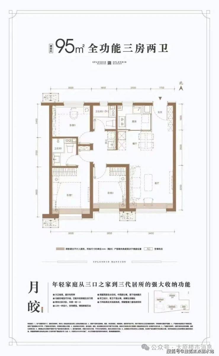 万科锦庐95平三居,户型方正,南北通透,双卫生间设计。虽然北侧有连廊,但是整个小区的南北相邻楼栋,间距较大,东西侧基本无遮挡,采光还是很好的。功能齐全,性价比高。有赠送面积,得房率很高。