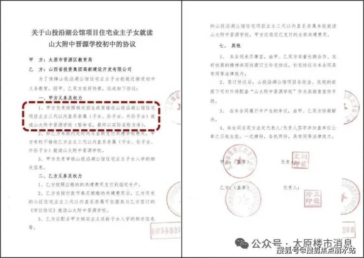 山西文旅御湖天萃,已经正式签约晋源区山大附中,售楼部内公示签约文件。省国企开发项目,后期物业服务有保障,教育配套有保障。均价一万二千左右,性价比很高。签约文件保障,直系三代亲属就读山大附中(子女,孙子女,外孙子女)。