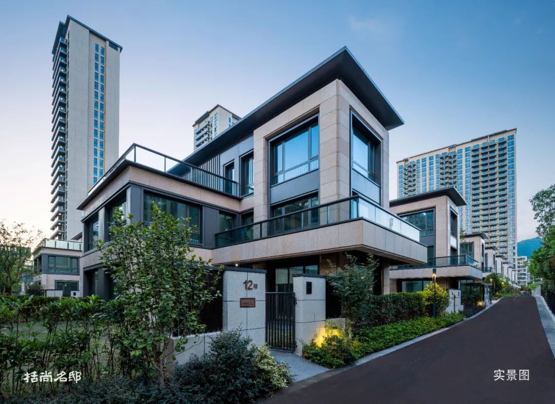 排屋部分,石材+铝板形制,营造简洁风格立面,城心罕见“L”型双拼形制,为56位丽水人物成就舒适的墅居享受。