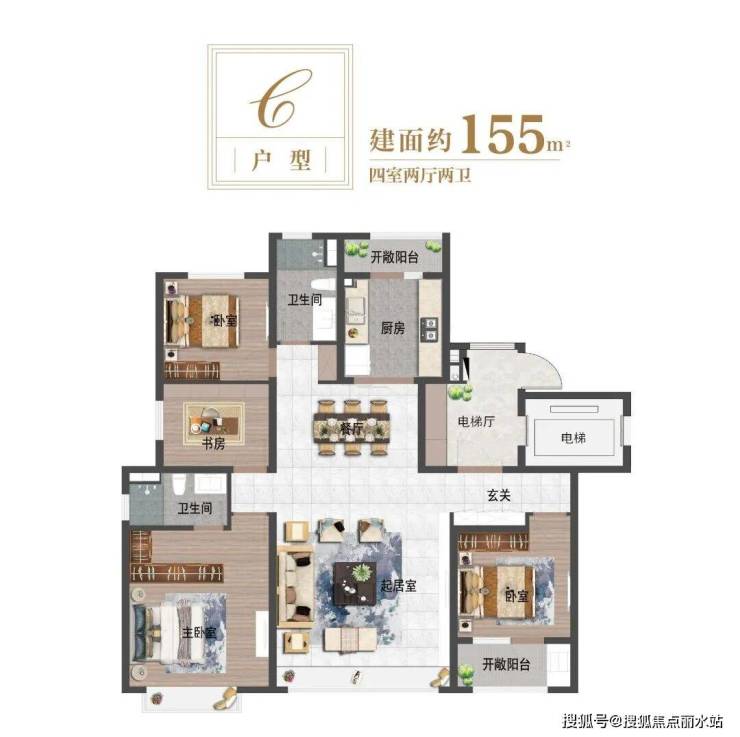 从户型来看,云锦组团155平米和170平米的大平层户型是十分出彩的。其中,155平米的四居室,做到了约12米的南向采光面;客餐厨一体化位于整个户型的中央,是家庭成员交流的主要场所;几个卧室和书房分布于四周,独立性极强,保证了每个家庭成员的私密性。