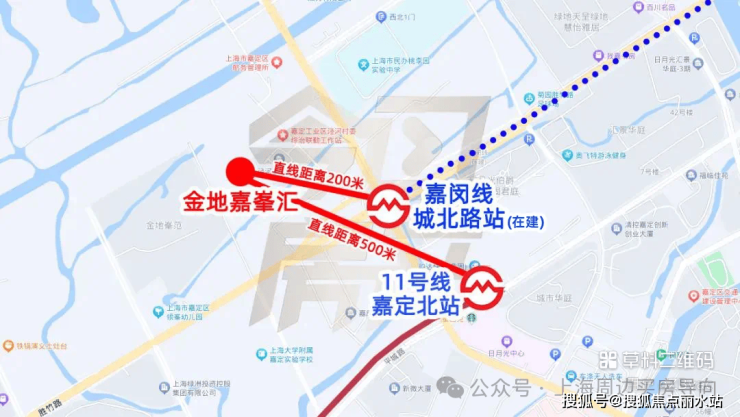 11号线嘉定西站直线距离约2.4km,嘉闵线嘉戬公路站(在建中,具体以政府规划为准)直线距离约2.5km
