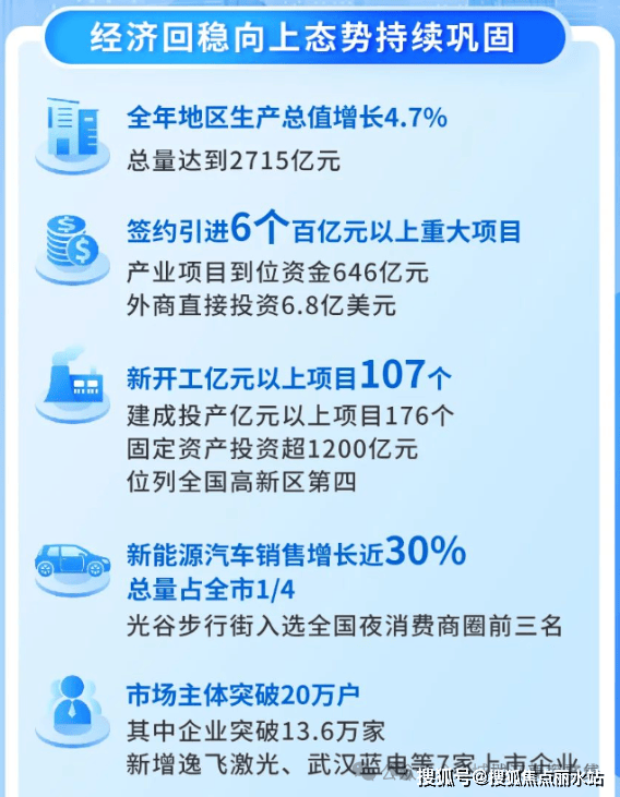 2023年,光谷GDP增长4.7%,总量达到2715亿元,与全省市州相比位列第七,签约引进6个百亿元以上重大项目,产业项目到位资金646亿元,外商直接投资6.8亿美元,均为武汉市第一。