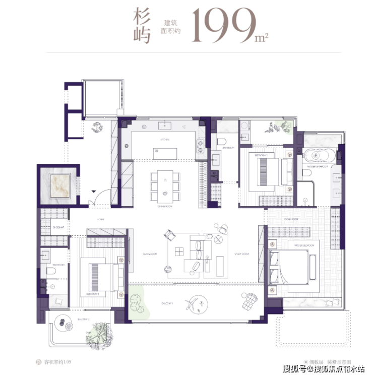 约80㎡套房主卧洄游式布局,衣帽间多到能放下所有衣物,还有瞰景阳台、阳光书房和度假风卫浴,住在这里天天都像在度假。