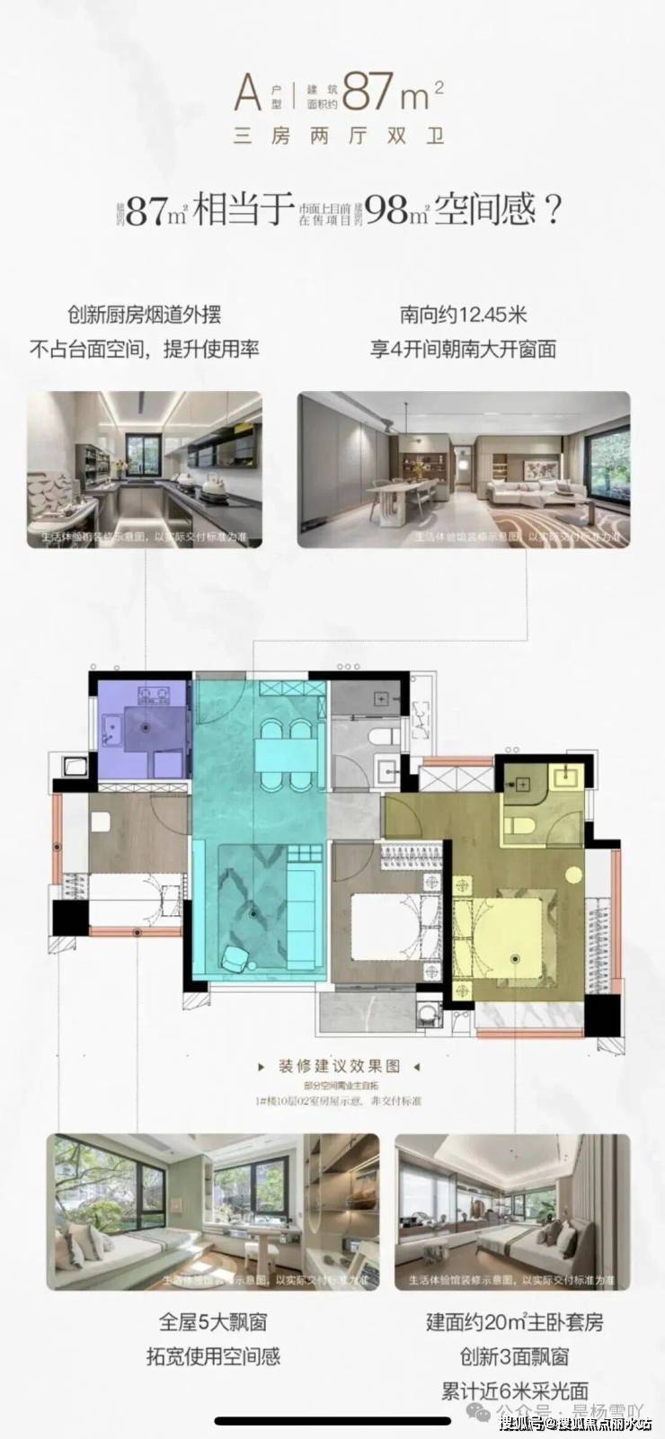 1.全2梯3户,套内综合使用率高达87%-89%