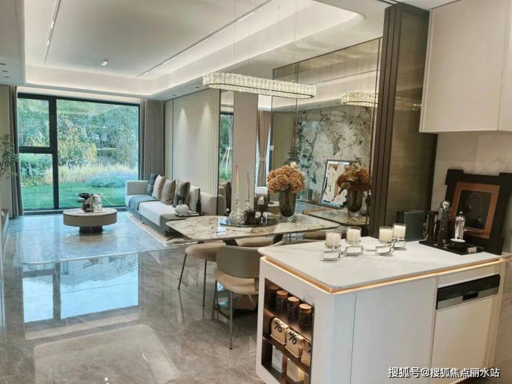 宽尺横厅配270°转角飘窗,LDKB一体设计含中岛台,融合烹饪、收纳与社交。