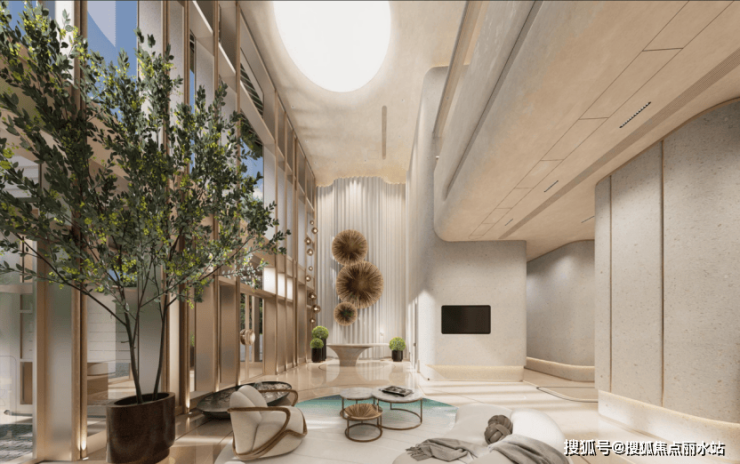 项目针对不同楼栋打造差异化公区,延续建筑“流动水纹”设计语言,融合自然元素与现代工艺。