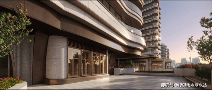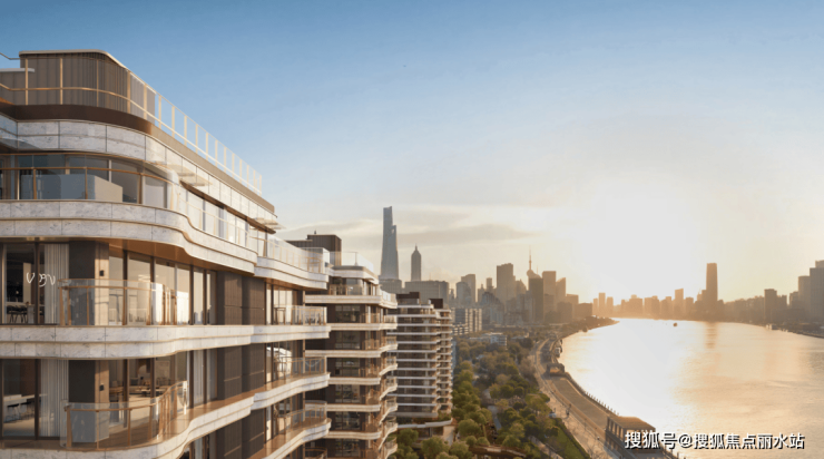 约270°蝶形阳台呼应江水曲线,波浪形立面与金属包边设计,将黄浦江流动感融入建筑;