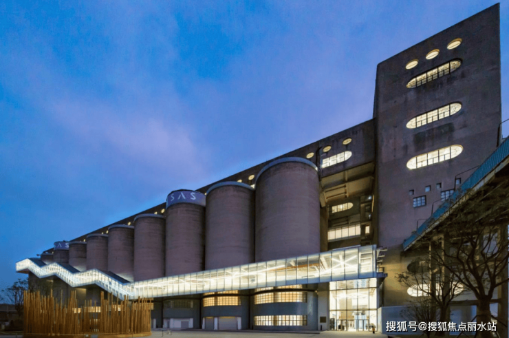红砖建筑改造为总部办公+艺术空间;8万吨筒仓顶层打造一线江景观景餐厅,中区引入美术馆/演艺空间,低区保留储粮漏斗改造成艺术展览;