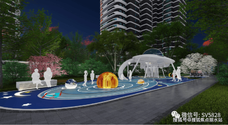 社区规划四大景观组团,每个组团含五大星空主题漫境区——星空漫步区、星空打卡区、星空互动娱乐平台、星空静谧花园、星空康体绿带等