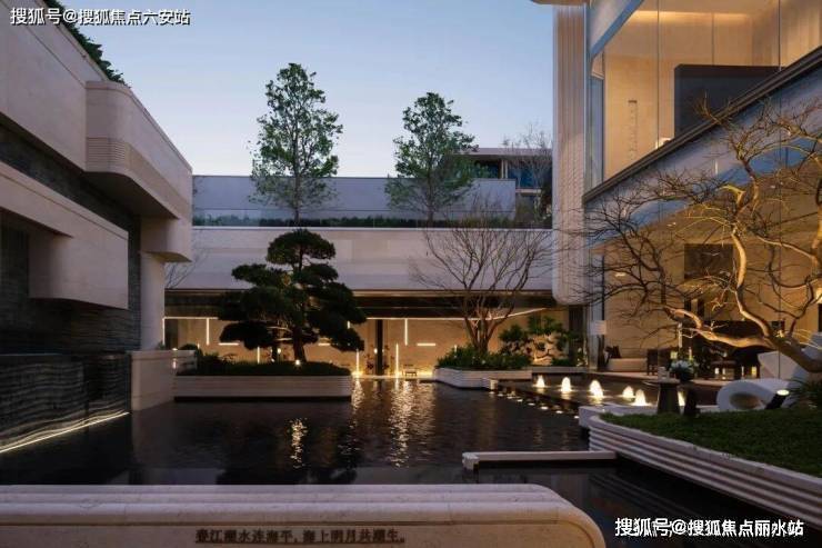 二进弧光织境,讲究“天圆地方”、“四水归堂”,中心水滴造型雕塑,形如宝瓶美轮美奂。