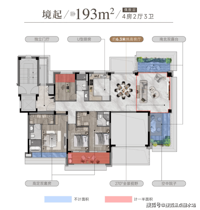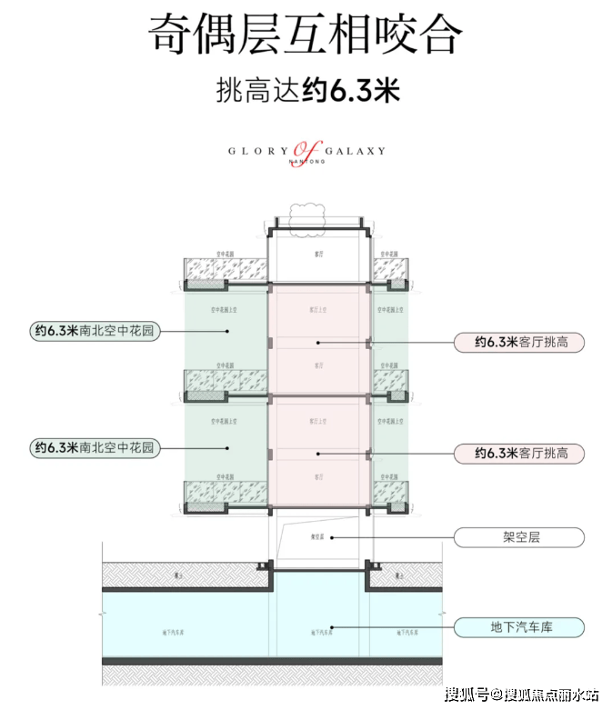 万濠东郡跃级四代宅,通过奇偶层错位互相咬合设计,让客厅及露台通高挑空,单层层高达到3.15米,客厅挑高达到6.3米!