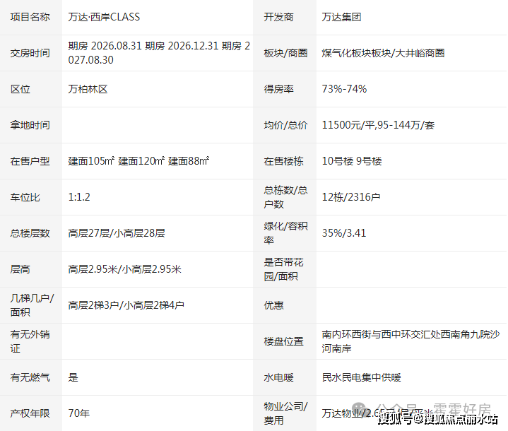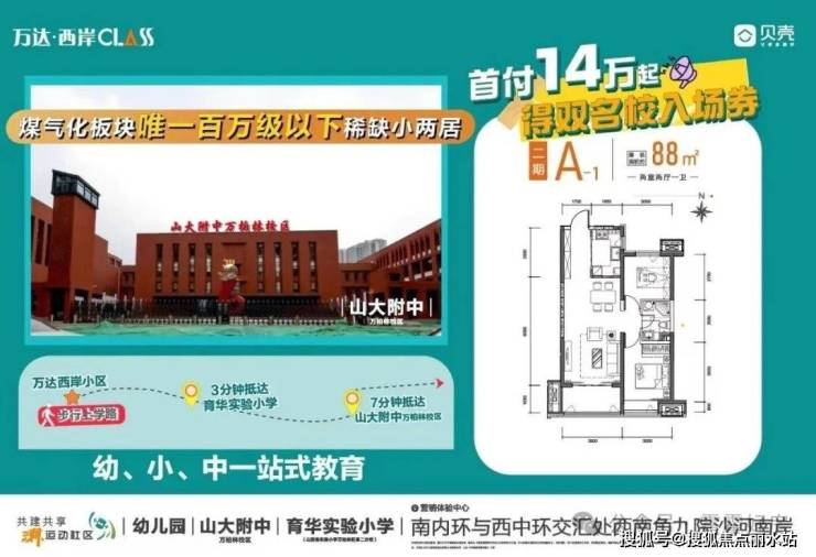 2020年9月,万柏林区教育局与山西省实验小学教育集团成功签订教育发展战略合作协议,在煤气化片区打造山西省实验小学万柏林第一校区与山西省实验小学万柏林第二校区(新道街小学),切实满足人民群众对优质教育的新期待。两所小学按照土地出让条件,由中铁诺德逸尘云著项目以及华润·华侨城公园九里项目无偿代建,建成后移交万柏林区教育局。两所小学是属于区教育局统一管理的公立公办小学,目的是保障煤气化片区居民义务教育阶段需求。万达·西岸CLASS位于南内环西街与西中环交汇处西南角。项目主推85-135㎡户型,支持一次性、按揭付款,开发商担保公积金贷款。