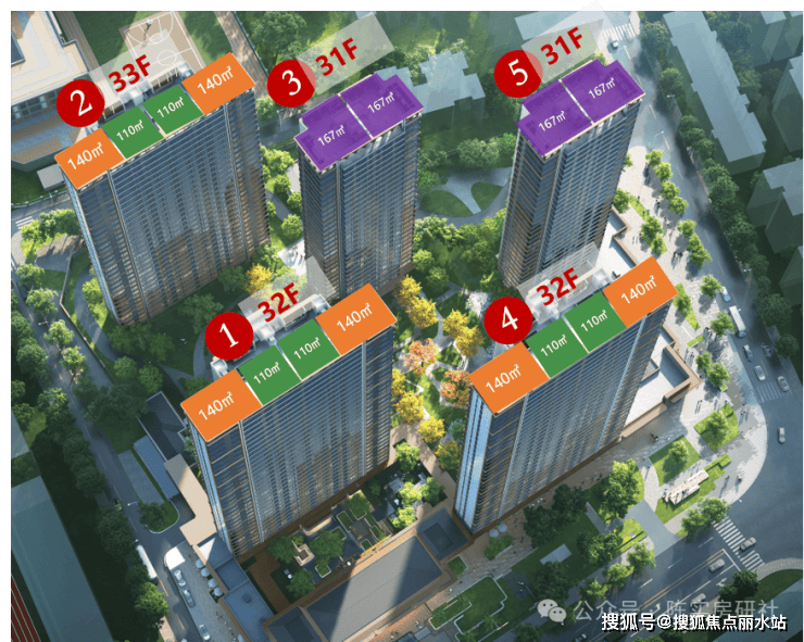 从平面图看,该项目楼栋均为南偏东朝向,其中1、4号楼为32层,2号楼为33层,3、5号楼为31层;该盘红线内配建一所小学,这就是群建路学校改扩建工程。